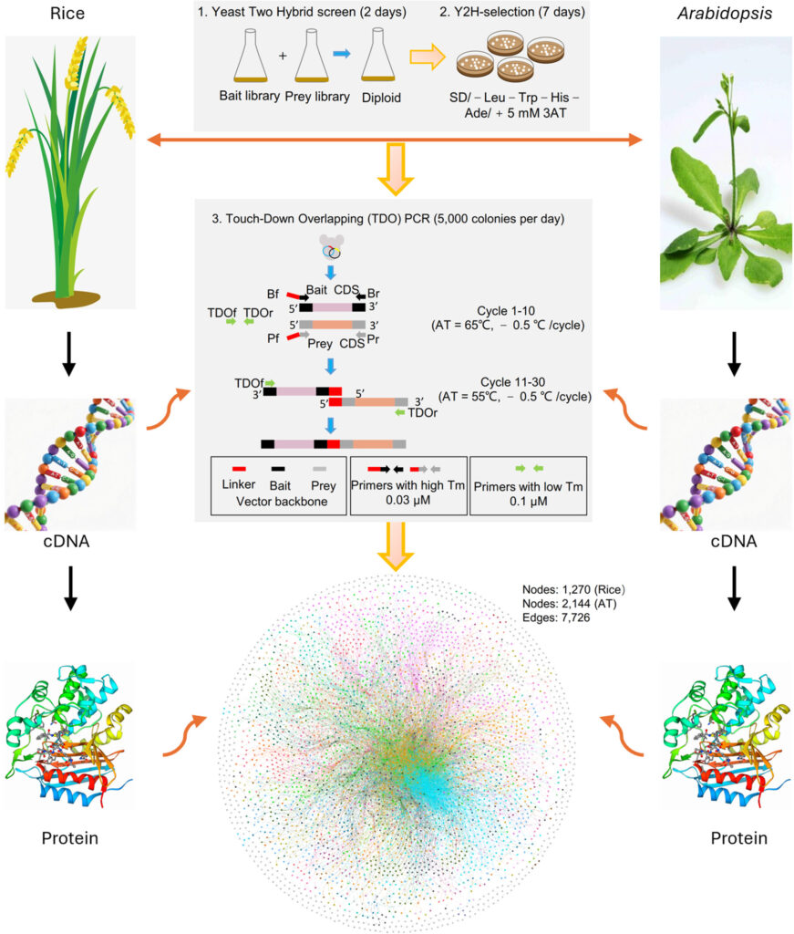 Touch-down overlapping PCR coupled with HiFi long-read sequencing, a high-throughput method for large-scale profiling of protein-protein interactions based on stitch-PCR identified 7,726 high-confidence interactions between rice and Arabidopsis proteins by integrating a library-vs-library yeast two-hybrid strategy with optimized PCR and long-read sequencing.